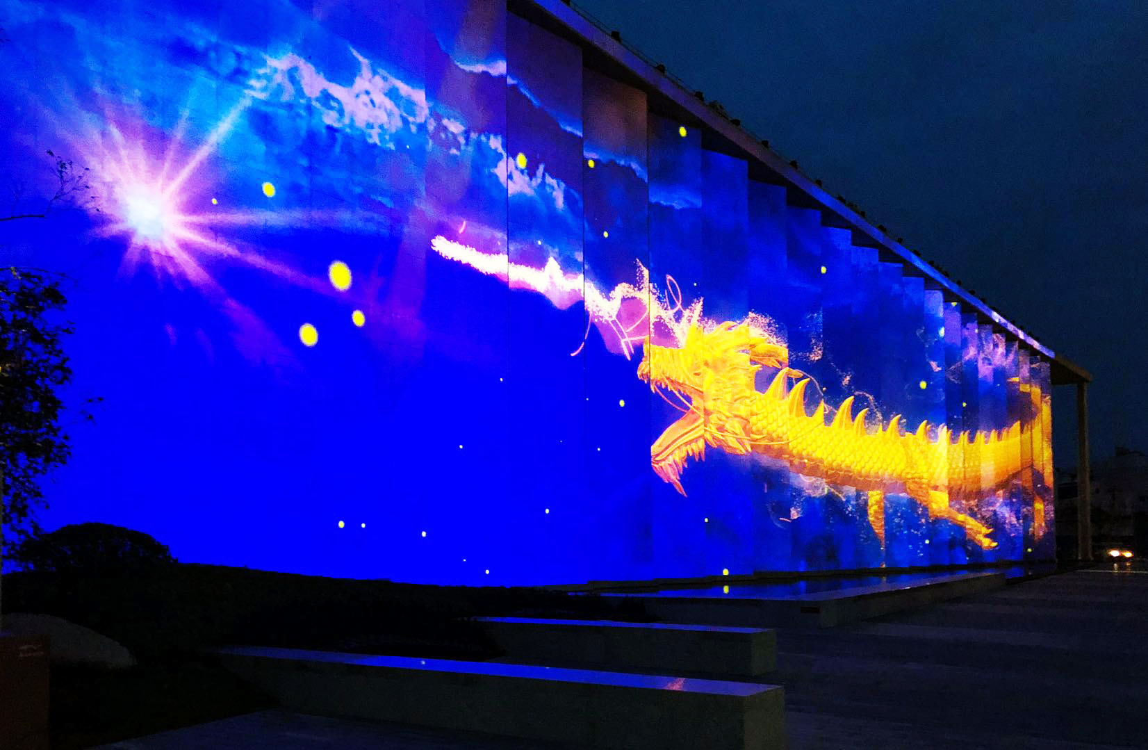 開放當晚,斥資數千萬元打造的3D夢幻燈光秀震撼開演。該表演由美盛地產集團邀請國際頂尖專業團隊,以場館外墻為主體量身定制。配合著震撼律動的音樂,燈光秀以啟迪、成長、化蝶、騰龍四個篇章的3D魔變,為現場市民奉上了一場精彩的視聽盛宴。
