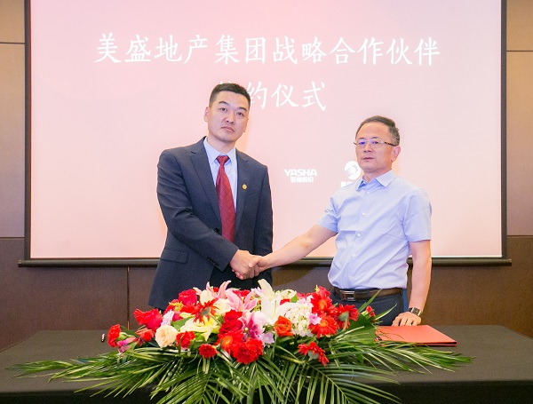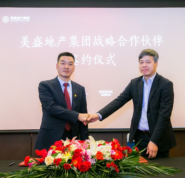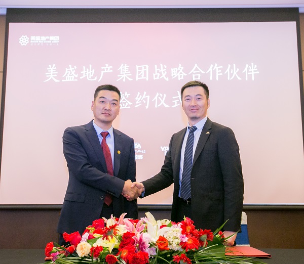 美盛地產(chǎn)集團(tuán)副總裁蘇揚(yáng)先生與浙江亞廈裝飾股份有限公司亞廈裝飾總經(jīng)理張小明簽署戰(zhàn)略合作協(xié)議