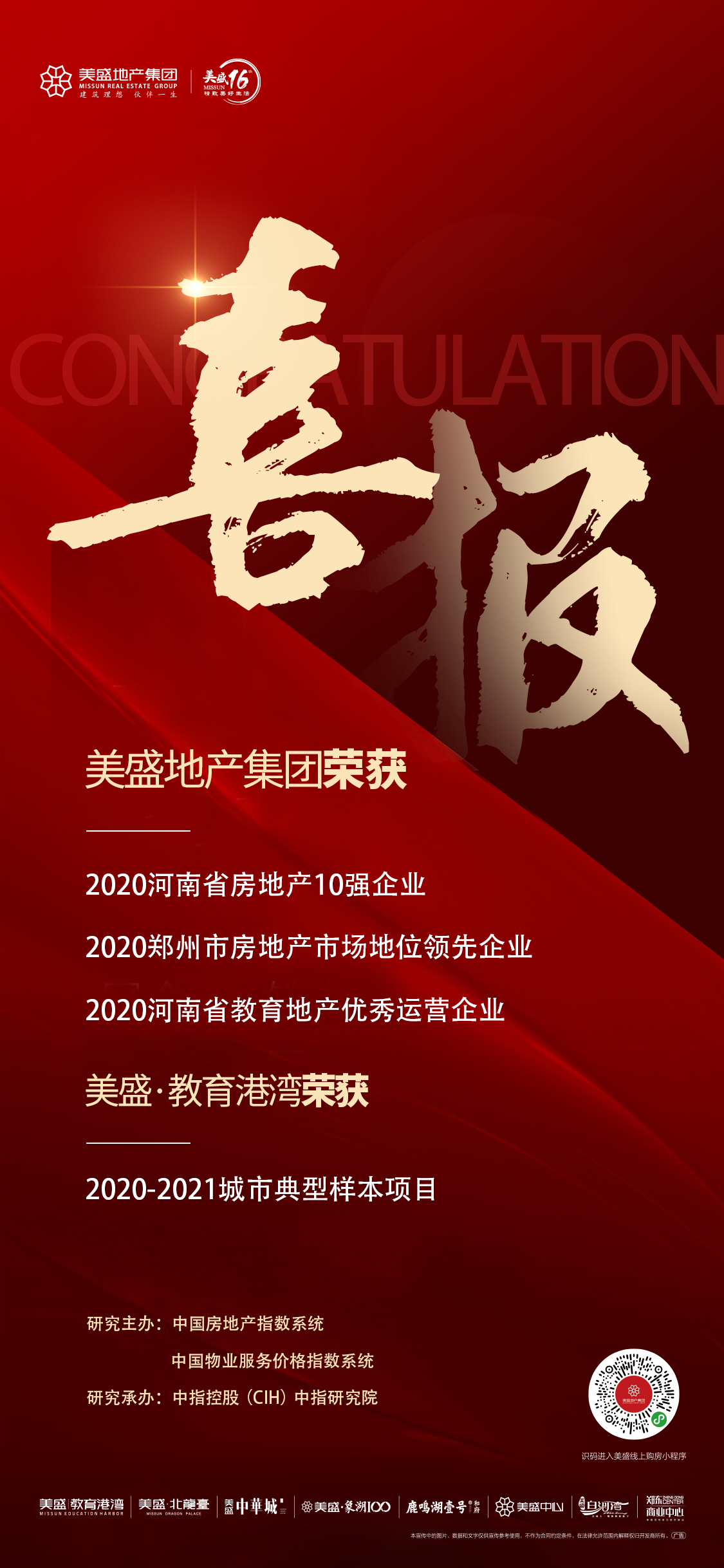 其每屆評選都引領地產行業前沿和市場趨勢,挖掘行業優秀品牌,已成為業內最受關注、最有影響力的年度盛會之一。此次評選中,美盛地產集團榮膺“2020河南省房地產10強企業”、“2020鄭州市房地產市場地位領先企業”“2020河南省教育地產優秀運營企業”等多項殊榮,其中美盛·教育港灣在諸多經典佳作中脫穎而出,榮膺“2020-2021城市典型樣本項目”。