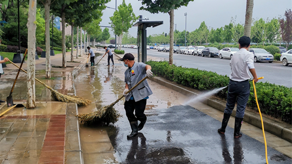 在雨水絲毫不減,越下越急的危機時刻,工程部師傅們毅然踏入水中,一點一點清理被堵的排水口,盡全力保障業(yè)主家園安全。平均年齡比其他各部門都高的環(huán)境部工作人員,絲毫沒拖任何后腿,全力向前,爭分奪秒地不間斷補位吸水排污,順利完成美盛中心地下三層車庫無積水出現任務。