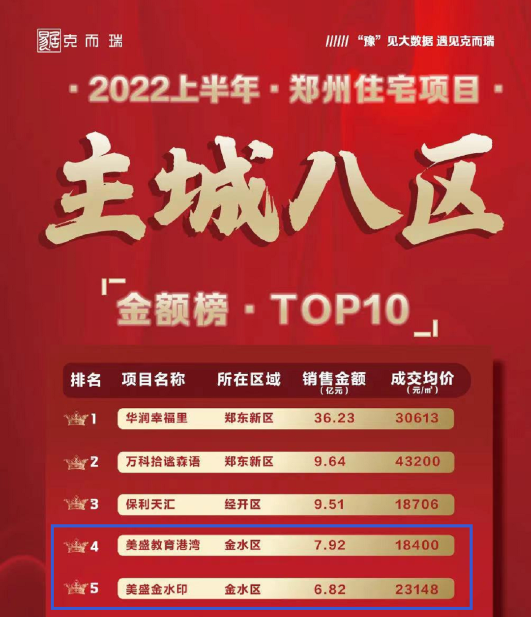 據國內權威市場研究機構易居克爾瑞發布的《2022上半年鄭州住宅項目主城八區金額榜TOP1O》顯示:
